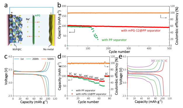 圖6. 含有mPG-12@PP和PP分離器Na||NVP@C全電池的電化學(xué)性能。(a)含有mPG-涂層分離器的Na||NVP@C全電池的示意圖。(b)在2 C的電流密度下獲得的循環(huán)穩(wěn)定性。(c) 在2 C的電流密度下,含有mPG-12@PP分離器的Na||NVP@C全電池的恒電流充放電曲線(第1次、第200次和第500次循環(huán))。(d) 電流密度從1到30 C時(shí)測量的倍率能力。(e) 在不同的C-速率時(shí)獲得的含有mPG-12@PP分離器的Na||NVP@C全電池的恒電流充放電曲線。