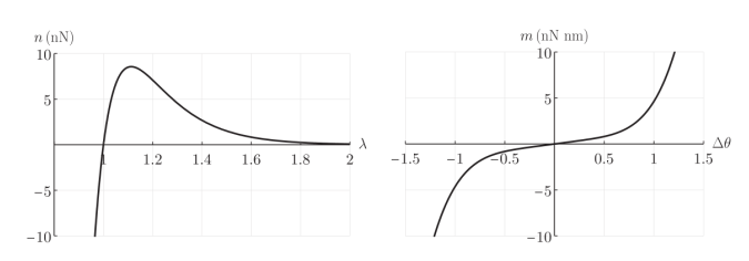 圖2. 桿-彈簧模型元件的本構行為。(a)桿的軸向力和縱向拉伸之間的關系。(b)彈簧的彎矩和鍵角變化之間的關系。