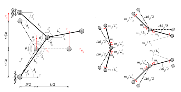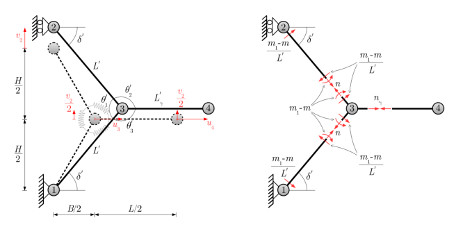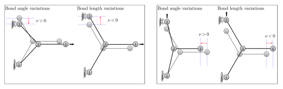 圖3. 石墨烯的代表性晶胞受到平面內大變形的分析。(a) 參考構型和變形構型。每種模態(tài)都有兩個自由度,并引入約束以避免剛性運動。(b)由于鍵角變化而產生的在桿上的彎矩和剪力。