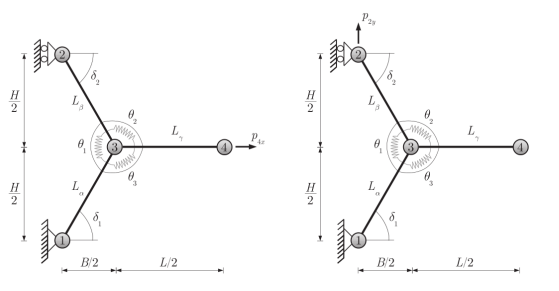 圖4. 對稱變形情況下石墨烯的代表性晶胞。(a)參考構型和變形構型。運動學簡化了,現在只由三個自由度控制。(b)變形構型中的內部作用。