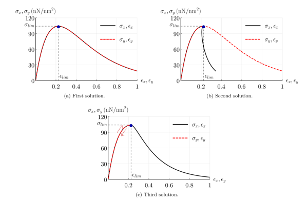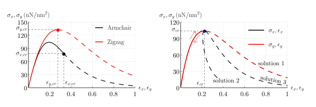 圖13. 石墨烯的穩(wěn)定(實線)和不穩(wěn)定(虛線)平衡路徑。(a)扶手椅和鋸齒形方向的單軸載荷。(b)等雙軸荷載。