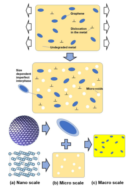 圖3. 石墨烯/金屬納米復(fù)合材料的塑性和漸進(jìn)降解粒徑依賴性的分級(jí)多尺度均勻化原理圖:(a)納米尺度體系;(b)微尺度系統(tǒng);(c)宏觀尺度系統(tǒng)。