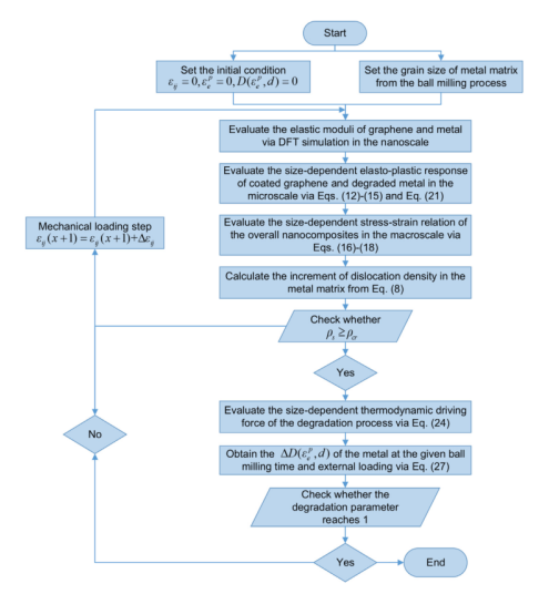 圖6. 石墨烯/金屬納米復(fù)合材料的塑性和漸進(jìn)降解粒徑依賴性的多尺度均勻化方案的數(shù)值模擬流程圖。