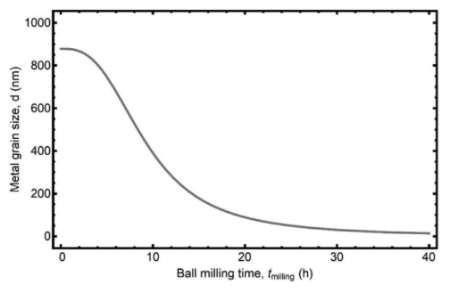 圖7. 石墨烯/鋁納米復(fù)合材料的金屬粒徑與球磨時(shí)間的關(guān)系(式(28))。