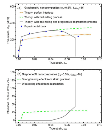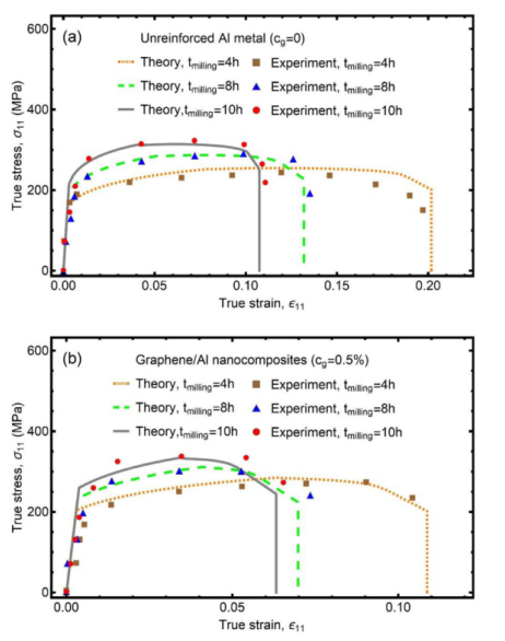 圖9. (a)未增強(qiáng)金屬Al和(b)石墨烯/Al納米復(fù)合材料的有效應(yīng)力-應(yīng)變曲線與球磨時(shí)間的關(guān)系。