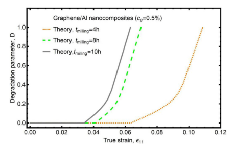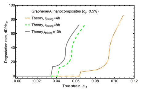 圖11. 不同球磨時(shí)間時(shí)石墨烯/鋁納米復(fù)合材料的降解率與真實(shí)應(yīng)變的關(guān)系。