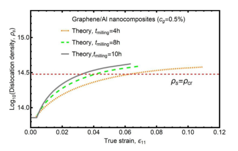 圖12. 不同球磨時(shí)間下,石墨烯/鋁納米復(fù)合材料的金屬基體中位錯(cuò)密度與真實(shí)應(yīng)變的關(guān)系。