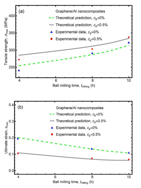 圖13. 不同石墨烯體積濃度時(shí)石墨烯/鋁納米復(fù)合材料的(a)拉伸強(qiáng)度和(b)極限應(yīng)變與球磨時(shí)間的關(guān)系。
