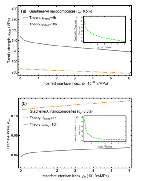 圖14. 不同球磨時(shí)間下石墨烯/鋁納米復(fù)合材料相對(duì)于不完美界面指數(shù)的(a)抗拉強(qiáng)度和(b)極限應(yīng)變。插圖描述了相對(duì)于不完美界面指數(shù)的相應(yīng)變化率。