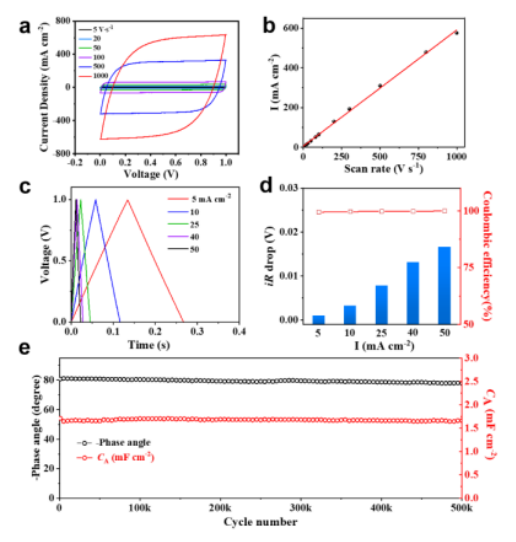Figure 4.EC-SVGA-2的電化學性能。a EC-SVGA-2 在高掃描速率下(1000 V s-1)的CV 曲線。b 在0.5 V電壓下放電電流密度與掃描速率的關(guān)系。c 在不同電流密度下的恒電流充放電曲線。d 電壓降和庫侖效率。e EC-SVGA-2的循環(huán)穩(wěn)定性評估。