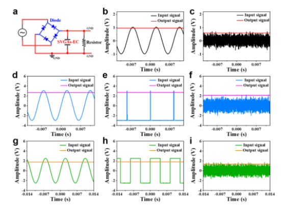 Figure 5. EC-SVGA-2 的過濾性能。a平滑交流信號的電路示意圖。b, c 單個EC-SVGAs在水性電解質(zhì)中的過濾性能。d-f串聯(lián)連接的EC-SVGA 在水性電解質(zhì)中的過濾性能。g-I 單個EC-SVGA在有機電解液中的過濾性能。