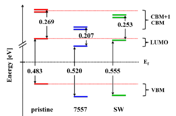 圖1 a (6,5)碳納米管中的7557和SW缺陷b CNT/PDI異質(zhì)界面光誘導(dǎo)電荷動(dòng)力學(xué)的能級(jí)示意圖。
