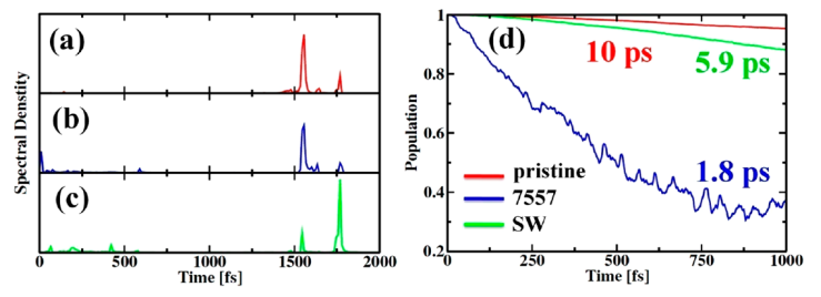 圖5 (a)原始、(b) 7557和(c) SW復(fù)合材料中e - h復(fù)合動(dòng)力學(xué)中供體和受體之間能隙的傅里葉變換(FTs)。(d)系統(tǒng)的e - h重組。