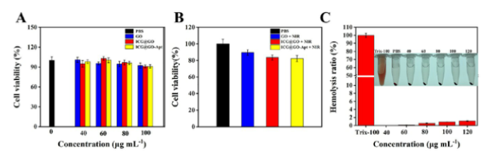 圖 6. NS 的細(xì)胞活力和溶血分析。 (A) 用不同劑量的 GO、ICG@GO 和 ICG@GO-Apt NSs 處理的 HEK 293 的生存能力。(B)在NIR 刺激后,HEK 293 與不同 NSs (80 μg m L-1) 孵育的細(xì)胞活力。(C) Triton X-100、PBS 和不同濃度 ICG@GO-Apt 的相對溶血率。 插圖是相應(yīng)的照片。