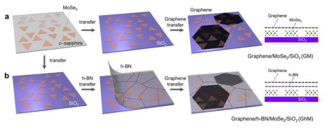 2/Si 晶片上,然后通過隨后的轉(zhuǎn)移被CVD生長的石墨烯島覆蓋。 最右邊的圖像說明了制備的垂直異質(zhì)結(jié)構(gòu) (GM) 的側(cè)視圖。 (b) 在石墨烯島的二次轉(zhuǎn)移之前,主要由CVD生長的 h-BN 層覆蓋的 MoSe