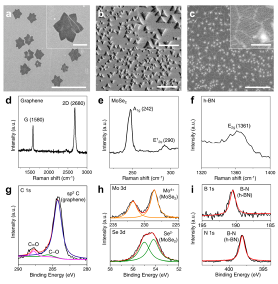 2域和 (c) Cu箔上的 h-BN 層的 SEM 圖像。 插圖是代表性域的放大圖像。 比例尺:(a) 100 um;(b) 2 um;(c) 5um。 內(nèi)嵌比例尺: (a) 10 um;(b) 1um;(c) 1um。(d-f) 對應于石墨烯、MoSe