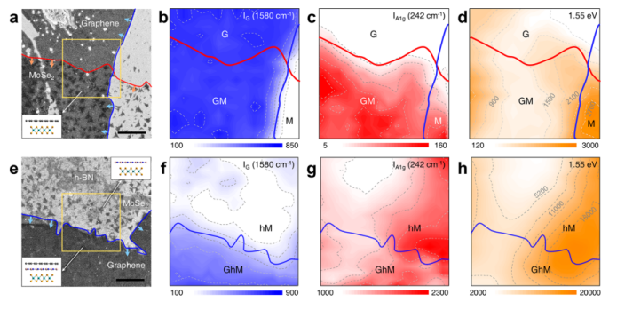 圖 3. 垂直vdW異質(zhì)結(jié)構(gòu)。(a) GM垂直vdW異質(zhì)結(jié)構(gòu)的SEM圖像。每個域區(qū)域的邊界用實線突出顯示:藍色,石墨烯;紅色,MoSe