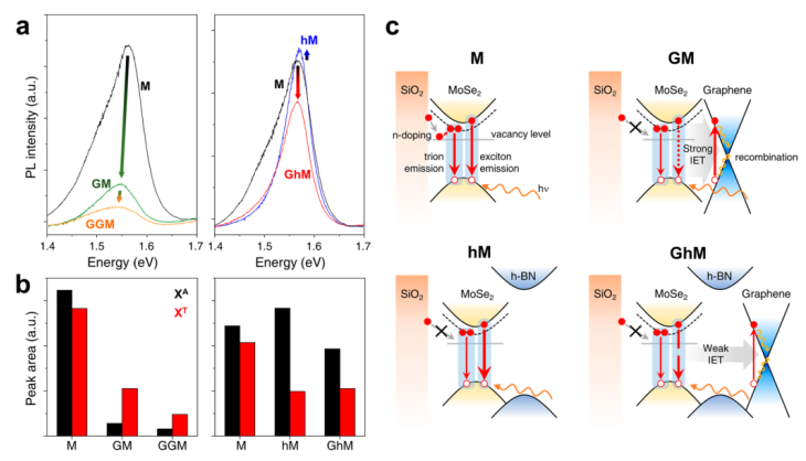 圖4。vdW垂直異質(zhì)結(jié)構(gòu)的層相關(guān)光致發(fā)光。(a)從GM(左)和GhM(右)樣品的三個不同區(qū)域獲得的PL光譜。(b)根據(jù)層結(jié)構(gòu),光致發(fā)光峰值強度的直方圖解卷積成自由激子(XA)和負三子(XT)發(fā)射。(c)vdW垂直異質(zhì)結(jié)構(gòu)中激子/三重子發(fā)射過程的示意圖,取決于襯底接近度和IET。每個發(fā)射的相對強度由箭頭的厚度表示。實心和空心紅點分別表示電子和空穴。