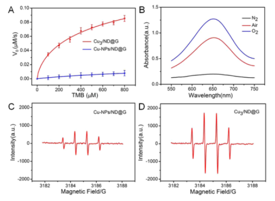Figure 3.Cu-NPs/ND@G和Cu3/ND@G 的類似氧化酶樣活性。(A) 在空氣飽和的NaAc緩沖溶液中的典型米氏圖。(B) 在O2飽和、空氣飽和、以及N2飽和的 NaAc 緩沖液條件下,Cu3/ND@G 的紫外-可見 (UV-vis) 吸收光譜。(C) Cu-NPs/ND@G和(D) Cu3/ND@G在空氣飽和的NaAc緩沖溶液(pH = 4.5)中生成DMPO/•OH 加合物的ESR譜圖。