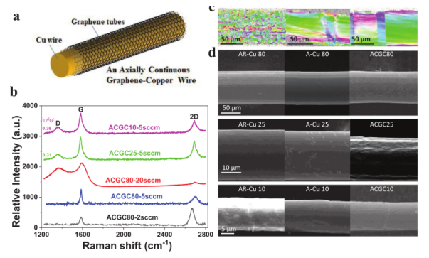 Figure 1. 銅和軸向連續(xù)石墨烯-銅(ACGC)線的微結(jié)構(gòu)表征。a)ACGC電線示意圖。b) 銅線上不同石墨烯生長條件下的拉曼光譜。c)EBSD顯微鏡圖像。d)不同樣品的SEM圖像。注意,退火和生長石墨烯后,銅線的直徑減小。