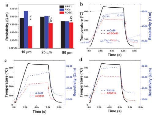 Figure 2. 原始獲得的(AR-Cu), 退火處理后 (A-Cu), 和 ACGC 導(dǎo)線(不同直徑)的尺寸和溫度相關(guān)的電子特性。a)與尺寸相關(guān)的電阻率。b-d)與溫度相關(guān)的電阻率。