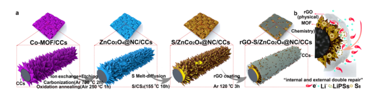 圖 1. (a) rGO-S/ZnCo2O4@NC/CCs 合成示意圖。(b) rGO“涂層”抑制“穿梭效應(yīng)”的硫儲(chǔ)存電化學(xué)機(jī)制。