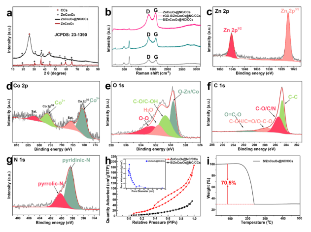 4@NC/CC復(fù)合材料的高分辨率Zn 2p、(d) Co 2p、(e) O 1s、(f) C 1s 和 (g) N 1s 光譜。 (h) ZnCo