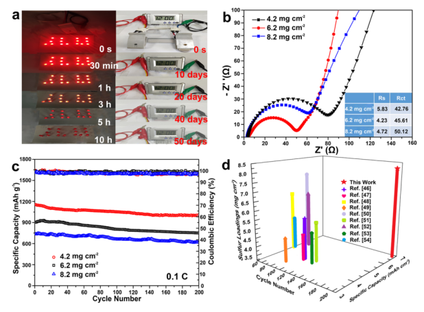 -2)。 (a) 單節(jié)電池觸發(fā)LED和電子表的照片。 (b) 奈奎斯特圖。 (c) 在0.1 C時(shí)的循環(huán)穩(wěn)定性。 (d) 這項(xiàng)工作的比容量、負(fù)載和循環(huán)性能與文獻(xiàn)中最近的相關(guān)報(bào)告的相關(guān)性。