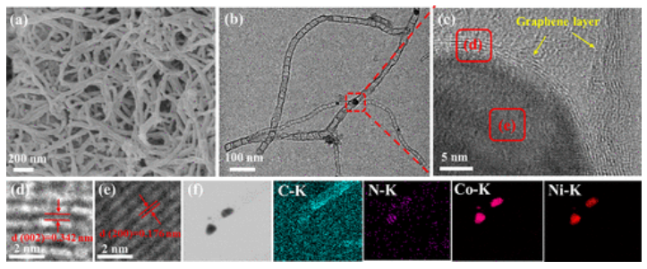 Figure 2. (a) CN@NC−2−800的SEM, (b) TEM和(c) HRTEM圖像。(d)石墨烯層和(e) CoNi合金的晶格條紋。(f) CN@NC−2−800的EDX元素映射。