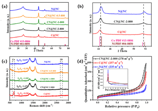 Figure 3. (a)樣品的XRD譜圖,(b)詳細(xì)的XRD譜圖,(c)拉曼光譜,(d)氮?dú)馕?脫附等溫線和孔徑分布(插圖)。