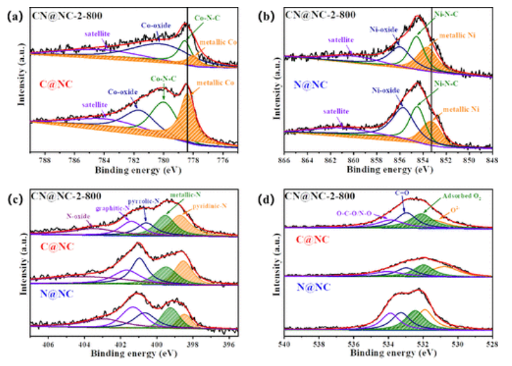 Figure 4. 樣品的高分辨率XPS光譜(a) Co 2p, (b) Ni 2p, (c) N 1s, (d) c 1s。