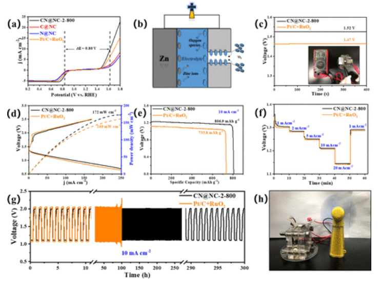 -2下的循環(huán)曲線。(h) 基于CN@NC-2-800的液態(tài) ZAB驅(qū)動(dòng)小風(fēng)扇的照片。