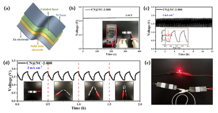 Figure 7. (a)柔性ZAB的內(nèi)部結(jié)構(gòu)。(b) CN@NC−2−800制備的柔性ZAB開(kāi)路圖。(c)柔性ZAB在2mA cm