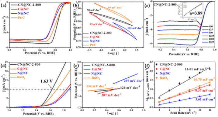 Figure 5. (a) CN@NC−2−800、C@NC、N@NC、Pt/C的ORR的LSV曲線和Tafel曲線。(c) CN@NC−2−800旋轉(zhuǎn)速率增大時(shí)的LSV曲線及其對(duì)應(yīng)的K−L曲線(插圖)。(d) LSV曲線,(e) Tafel曲線,和(f) Cdl在1.147Vvs RHE 下, CN@NC−2−800,C@NC, N@NC,和RuO