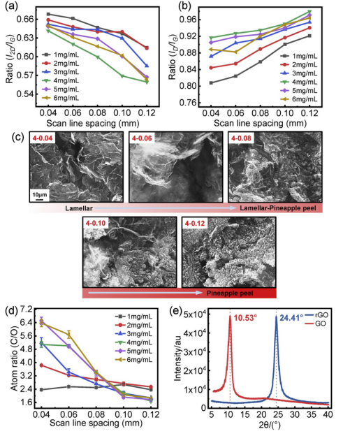 G的強(qiáng)度比。(c) 4 mg/mL LrGO薄膜的SEM圖像。(d) EDS分析C/O比值。(e) GO和LrGO的x射線衍射峰(d間距)的2θ角。