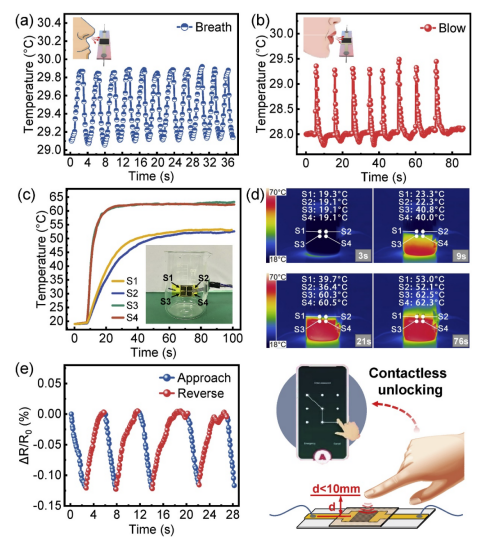 -1。利用優(yōu)化后的工藝參數(shù)制作的溫度傳感器具有響應(yīng)時(shí)間快、線性度好、滯后小、重復(fù)性好、性能穩(wěn)定等優(yōu)點(diǎn),并成功地用于監(jiān)測(cè)人體呼吸、吹氣和曲面溫度的時(shí)空變化。傳感器還可以檢測(cè)手指的距離。此外,還制作了用于密碼鎖非接觸式解鎖的3×3柔性溫度傳感器陣列。制備的陣列顯示了本研究開發(fā)的傳感器在非接觸式人機(jī)界面中的巨大潛力。