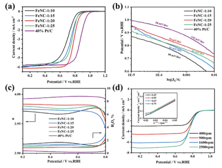 4 中的ORR 極化曲線;(b) 塔菲爾圖;(c) FeNC-1:10、FeNC-1:15、FeNC-1:20、FeNC-1:25和40% Pt/C的n數(shù)和H