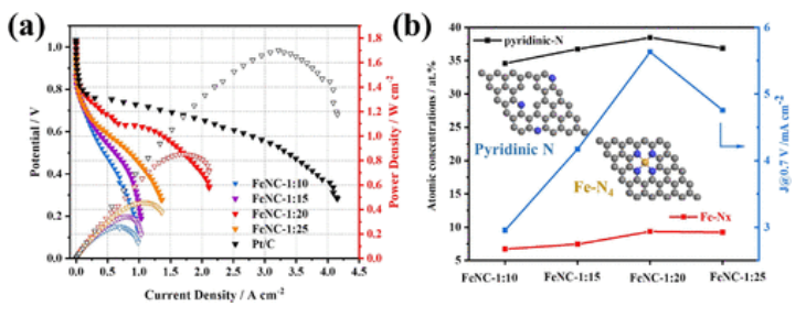 2 PEMFC 中作為陰極催化劑的性能。(b) 吡啶-N或Fe-Nx之間的線性關(guān)系和電流密度。