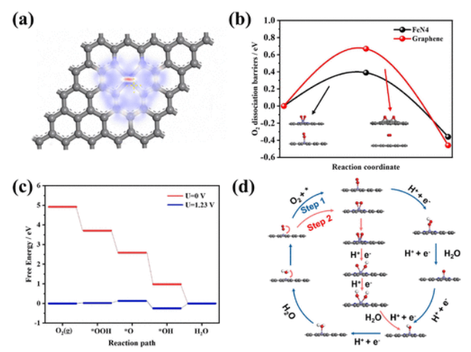 2解離勢(shì)壘;(c)考慮電極電位(U = 0和1.23 V)的酸性條件下催化ORR的反應(yīng)能量途徑;(d)在FeN
