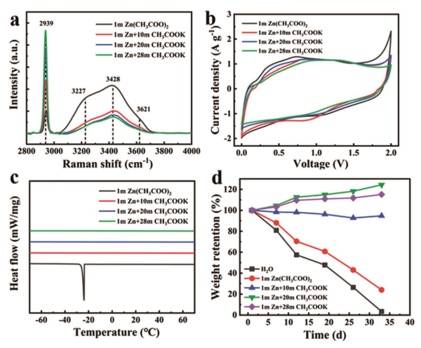 Figure 3. a)拉曼光譜,b)電壓窗,c)差示掃描量熱法(DSC)從−70℃到70℃的曲線,以及d) 1 M Zn(CH