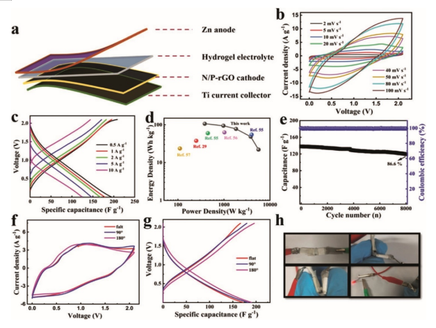 Figure 5. a) NP-rGO//NP-rGO超級(jí)電容器與1 M Zn(CH