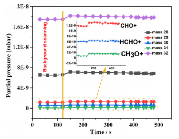 Figure 4.CO電催化表征。CoTPP/MWCNT復(fù)合材料用于CO電催化陰極電解液的質(zhì)譜分析。