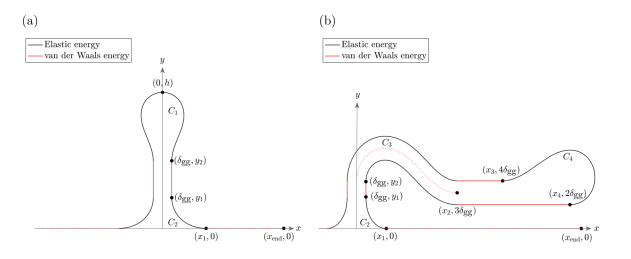 通過化學氣相沉積法生長的石墨烯中,通??梢杂^察到各種構型,包括波紋和褶皺。站立的自粘石墨烯褶皺在達到一定高度后會折疊為石墨烯折皺。我們采用連續(xù)近似法來預測由不同金屬基底支撐的石墨烯折皺的形態(tài)。我們的模型基于彈性彎曲和范德華(vdW)相互作用能量的平衡。我們將褶皺的幾何形狀劃分為三個組成部分,并將系統(tǒng)的總能量表示為這三個獨立的能量成分的總和。利用變分法將每個能量分量最小化,并推導出對應部分形狀的參數(shù)解。我們應用6-12 Lennard-Jones勢來模擬石墨烯-基底vdW相互作用的強度。當我們考慮折皺的兩種潛在構象時,分析顯示,折疊的雙分子層后面總是跟著一個平坦區(qū)域。該模型還預測了自粘褶皺的臨界高度,結果與之前的實驗和理論數(shù)據(jù)一致。該模型還預測了自粘褶皺的臨界高度,提供了與先前關于該過渡高度的實驗和理論數(shù)據(jù)一致的結果。