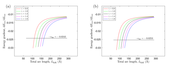 tot的函數(shù)。彩色線表示構象A的能量梯度,黑線表示構象B的能量梯度,其中交點給出了構象A每個γ值的長度L