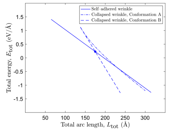 圖4.對于Cu(111)基底支撐的彎曲剛度為γ=1.2 eV的不同褶皺結構,總能量E