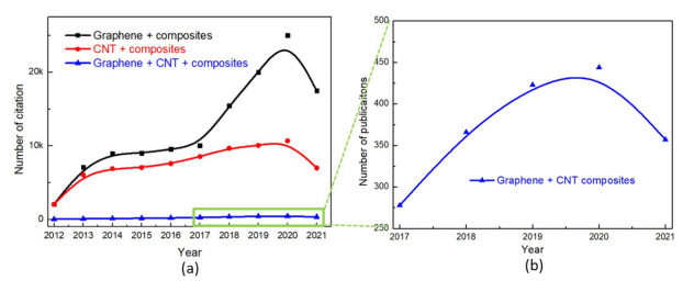 圖1. (a)2012-2021年標(biāo)題搜索中以碳納米管、石墨烯和復(fù)合材料為關(guān)鍵詞的出版物數(shù)量(Clarivate Analytic數(shù)據(jù)庫(kù);截至2021年7月),以及(b)2017年至2021年關(guān)于“碳納米管石墨烯復(fù)合材料”的出版物。