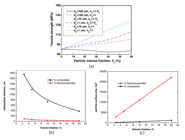 圖3. (a)顆粒大小對(duì)聚合物復(fù)合材料拉伸強(qiáng)度的影響。(b)微米級(jí)填料和納米級(jí)填料之間顆粒距離的比較,以及(c)總顆粒表面的比較。