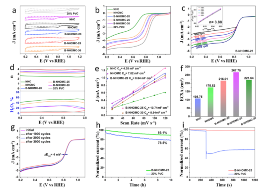 Figure 4.電化學性質(zhì)表征。不同樣品的(a) N2-或O2飽和的0.1 M KOH中CV曲線,(b) LSV曲線,和(c)不同轉(zhuǎn)速下的LSV曲線(插圖:相應的K-L圖)。(d)不同樣品的過氧化物產(chǎn)率(H2O2%)和電子轉(zhuǎn)移數(shù)(n),(e)計算的掃描速率和電容電流密度的線性擬合曲線,和(f)對應的ECSA。(g)B-NHOMC-25電極在1000、2000和3000圈CV循環(huán)前后的LSV曲線對比。(h)計時電流響應。(i)甲醇耐受性評估。