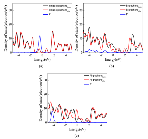 -離子吸附在硼摻雜石墨烯上時,吸附能、電荷轉(zhuǎn)移和電荷密度都大大增加,吸附距離顯著減小,通過電荷密度和態(tài)密度分析,發(fā)現(xiàn)存在明顯的雜化現(xiàn)象。通過比較能帶間隙的變化,還可以發(fā)現(xiàn)鋁摻雜石墨烯對F