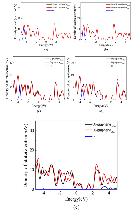 圖6. 態(tài)密度. (a)本征石墨烯-HF-F.(b)本征石墨烯-HF-H.(c)B-摻雜石墨烯-HF-F.(d)B-摻雜石墨烯-HF-H.(e)Al-摻雜石墨烯-HF-F。